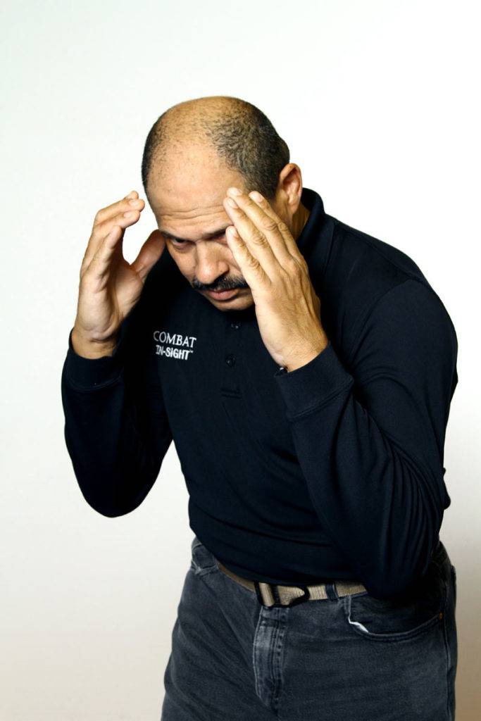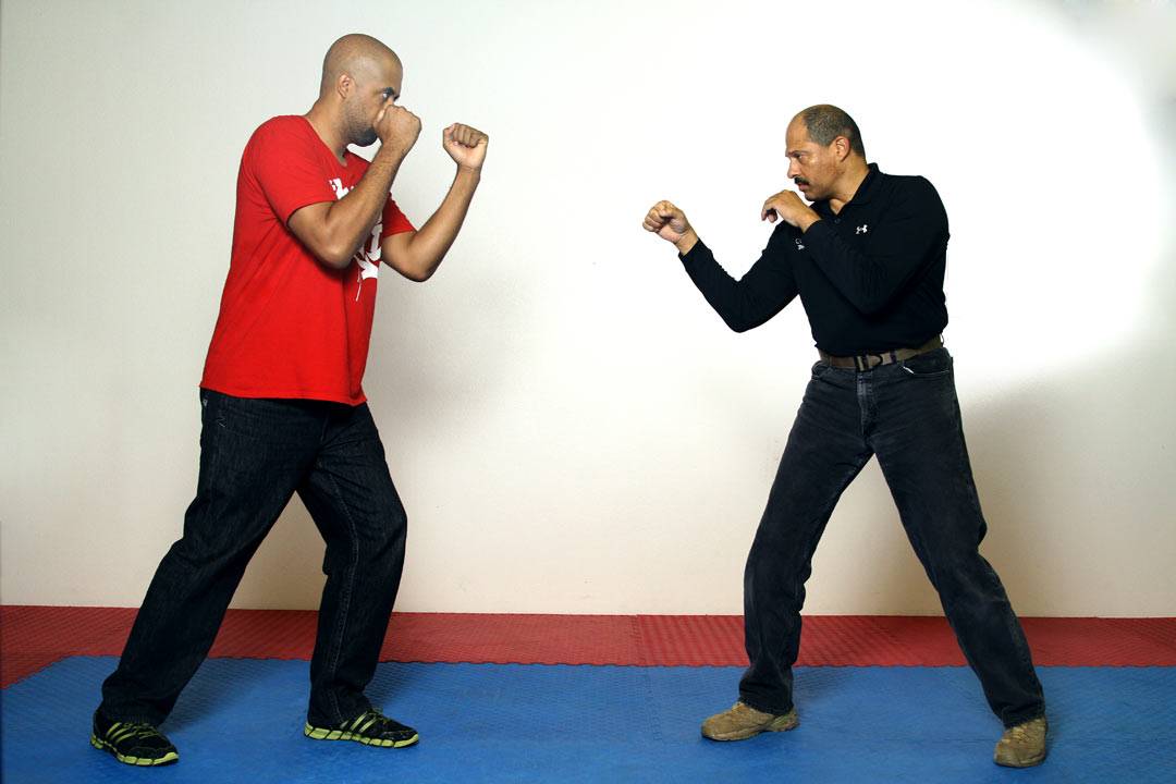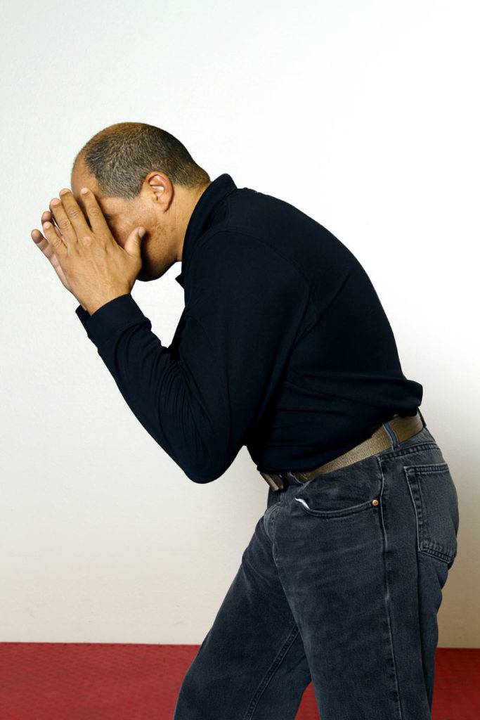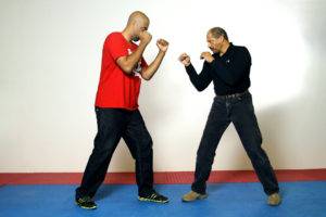 To keep things simple and direct, we will begin by using the emergency response as a point of reference from which we defend the vital areas of the upper body and launch our counterattack. Almost anyone can do this with no training at all as it’s a natural human instinct to lower the head and raise the arms when caught off guard. An added benefit of this posture is that it helps those with lesser body awareness feel more comfortable when faced with an attack because it is essentially a standing fetal position!
