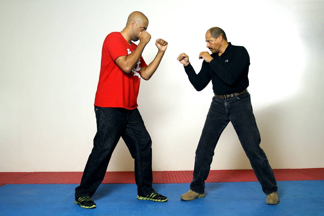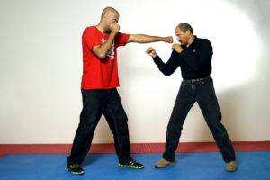 A crucial component in making any of the following counterattacks work is a sudden change of direction from the 45 degree outward angle of the emergency response to a 45 degree inward angle to take away the opponent’s balance. Change direction as many times as necessary, from outside to inside or vice versa.