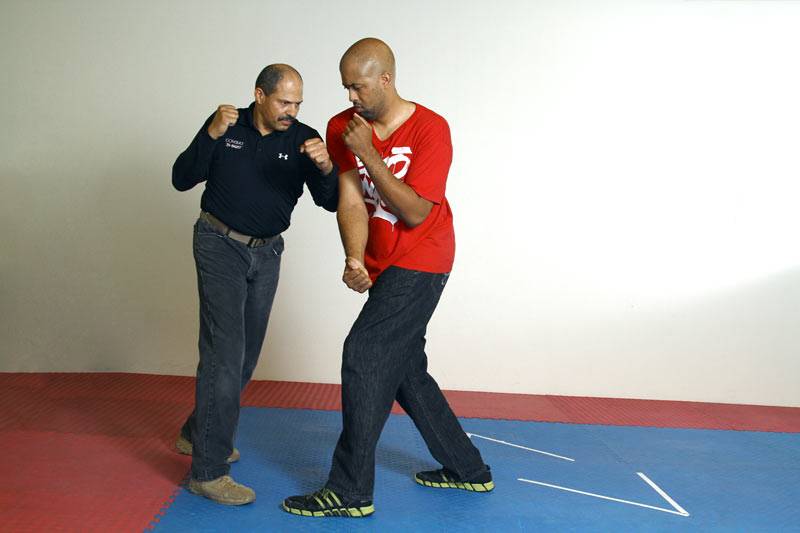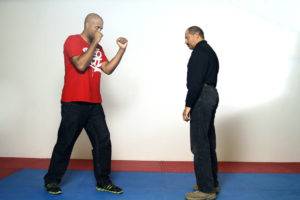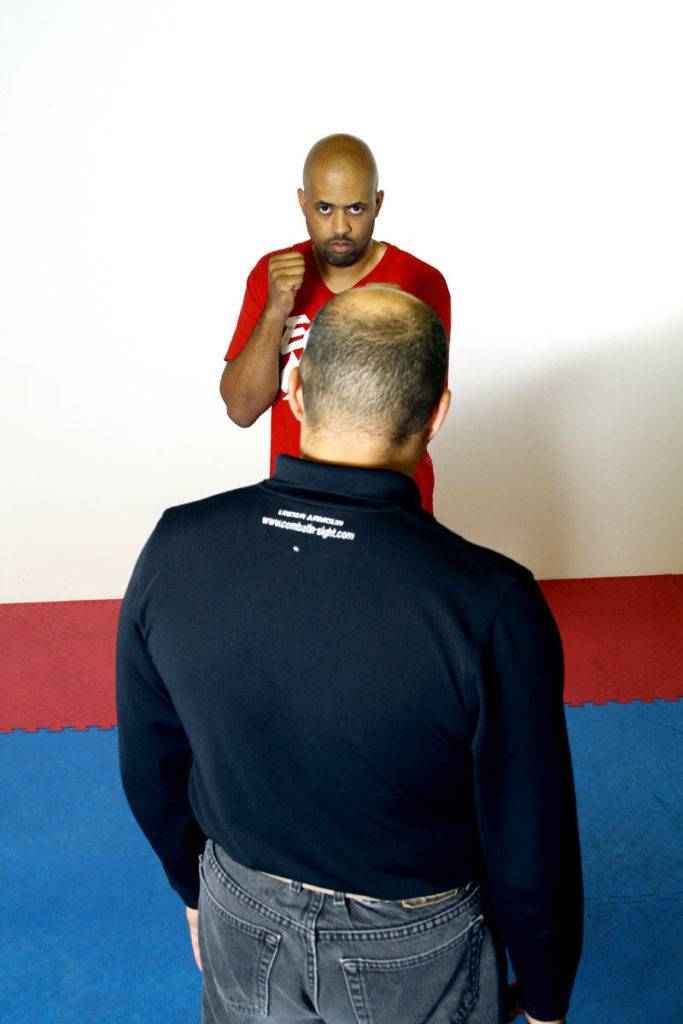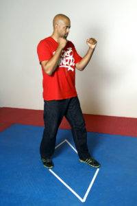 We get off the line by stepping with either foot at a 45 degree angle; The 11 o’clock position when stepping with the left foot, or the 1 o’clock position if stepping with the right. Depending on the opponent’s line of attack, we will end up either inside or outside of the opponent’s attacking limb.