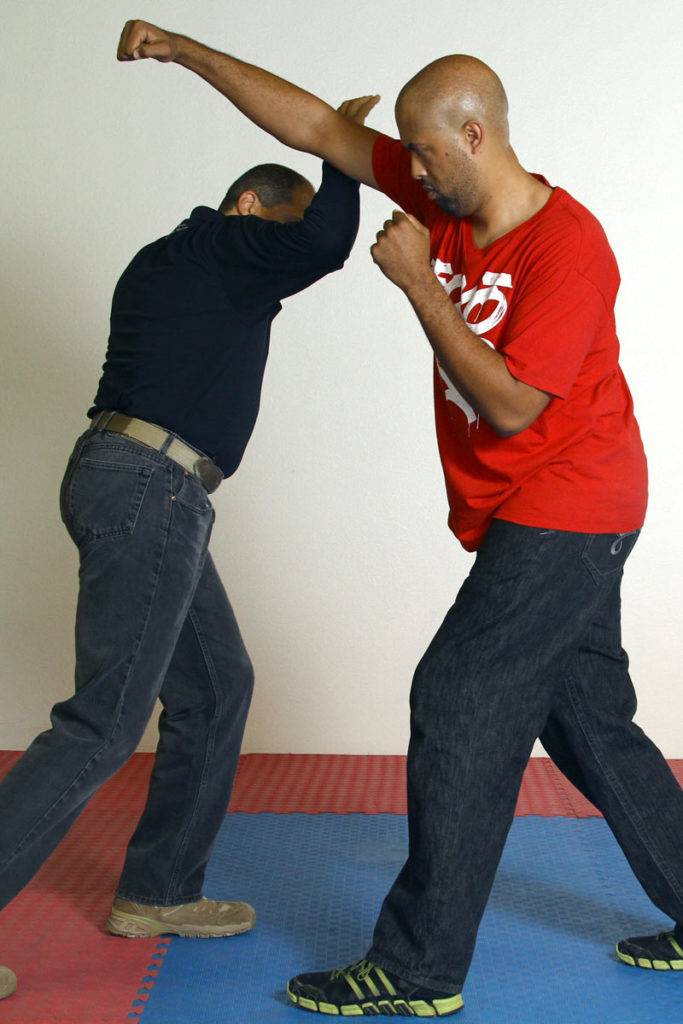 Here we’ll use a “Quarter Swing” strike with the rear hand to enter from the outside. It’s important to note that we use a drop step (falling step) when executing the quarter swing. The strike itself in this example is a downward chopping motion into the opponent’s attacking arm, right at the bend of the elbow. This will clear the line for an immediate Forearm Shunt to the neck.