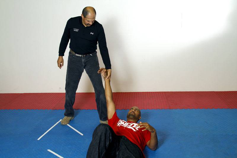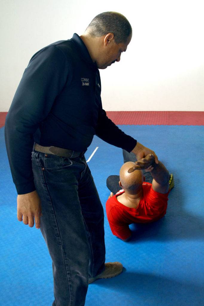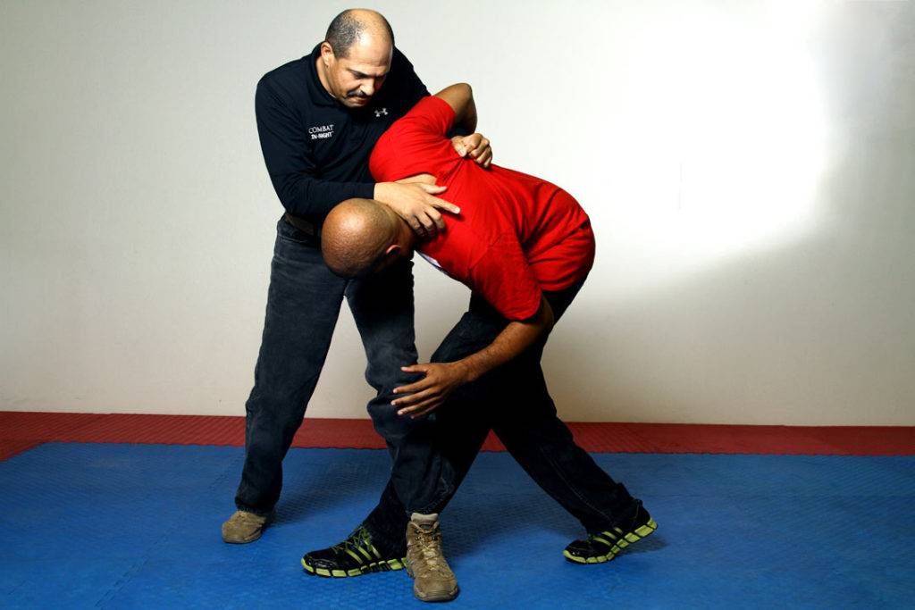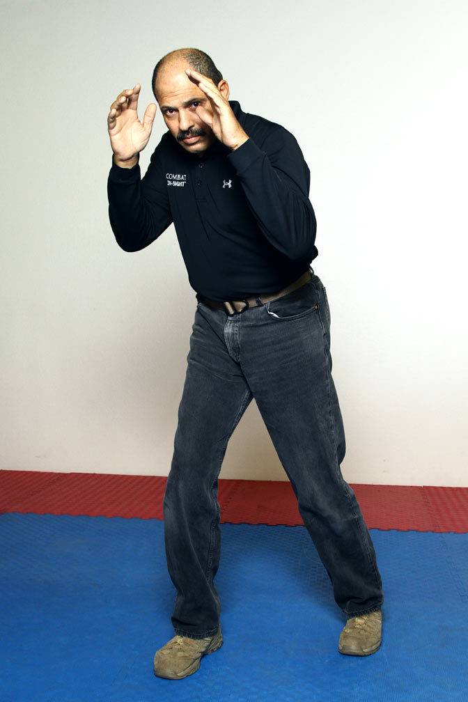Instead of going straight to force-on-force training, we start out at a low level of resistance and steadily increase from there. The first stage is what we call the Zombie Drill. Beginning from a neutral position at arms length, (See CQC – (82) photo) the trainer will attack in one of three ways: