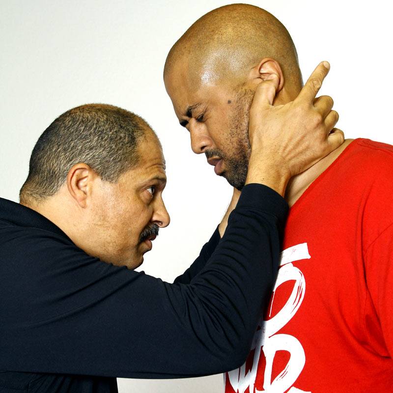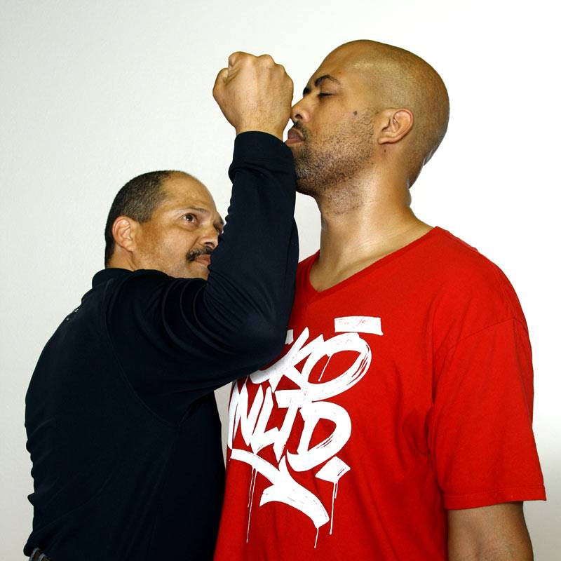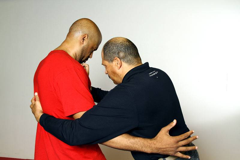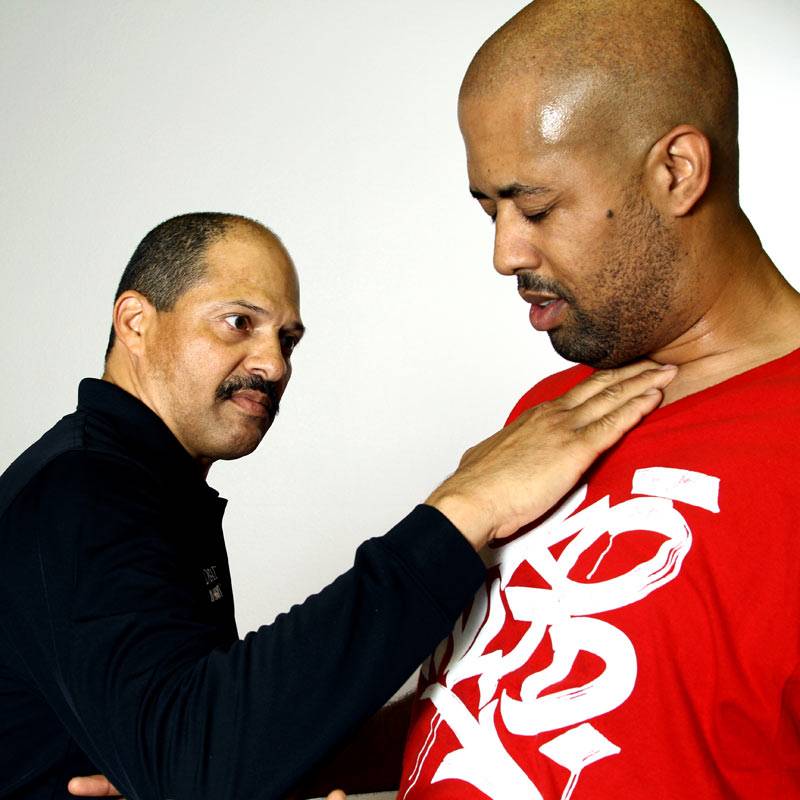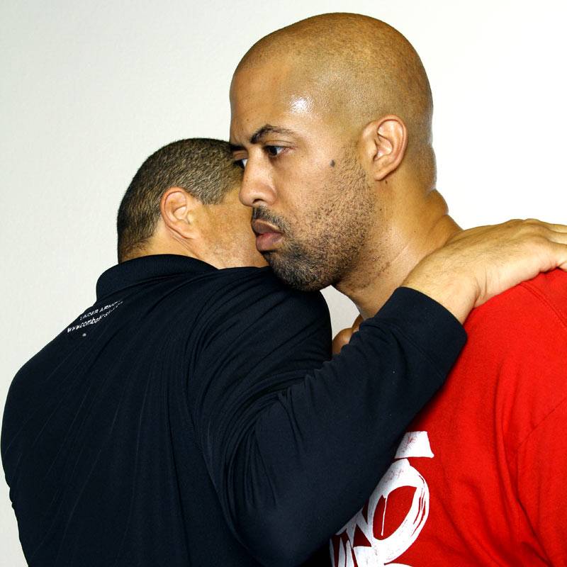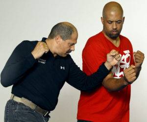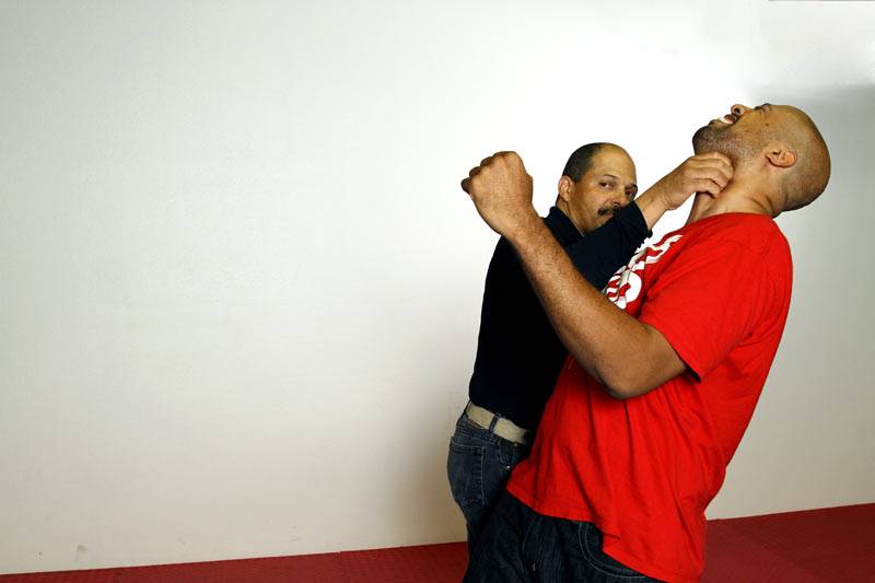 2 & 3) Dennis controls Joel’s striking arm and uses it as an anchor point while applying the Choke technique from our striking progression.