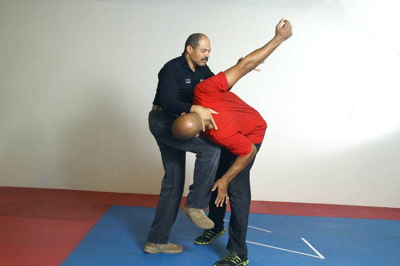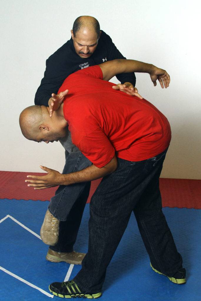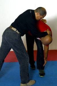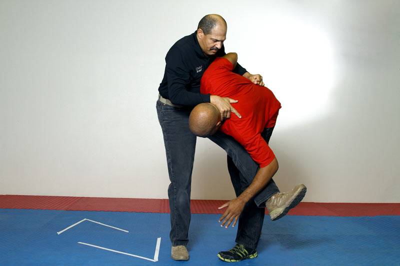 4) With Joel’s body weight moving up and back, Dennis uses a low post (slaps the kidneys) while continuing to drive forward. The forward drive takes Joel down to the ground.