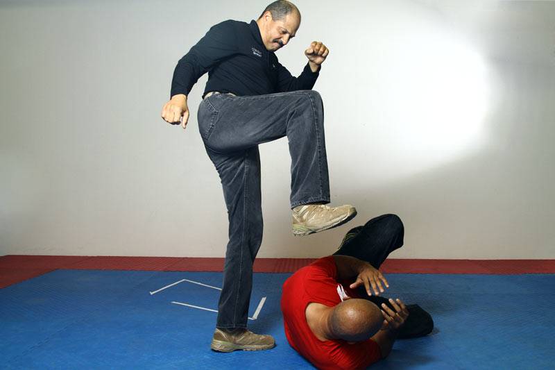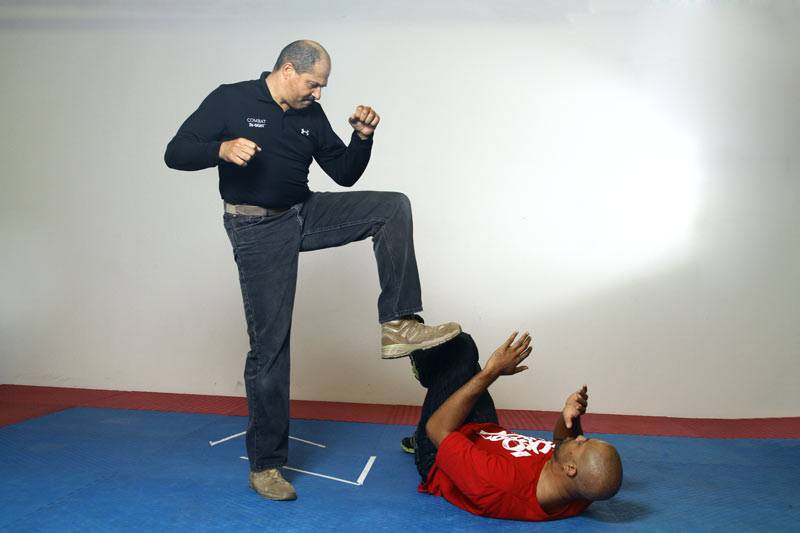 6) Dennis then delivers a knee strike but rather than retract the leg, he steps through and stomps the foot down to the ground (Repeat the ‘knee and stomp’ motion as many times as necessary to take the opponent down).