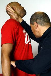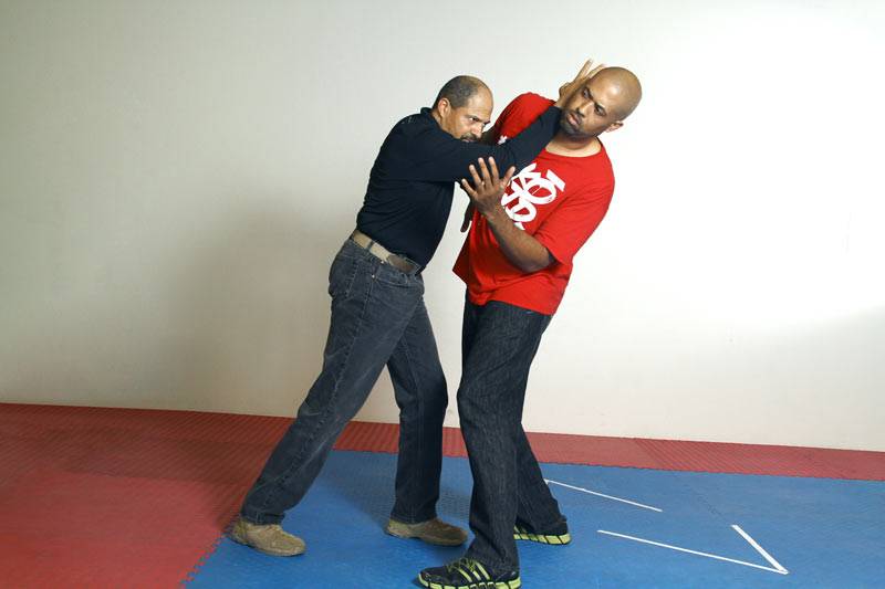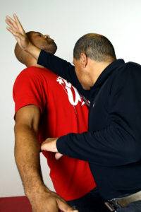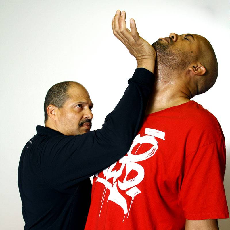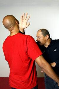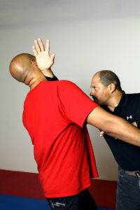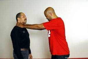 The striking surface here is the web of the hand between the thumb and index fingers. The strike makes impact in the center of the chest first, beginning from the sternal angle and driving upward to the throat. The impact of the strike will get the opponent’s head moving up and back, at which point the fingers will grasp the trachea.