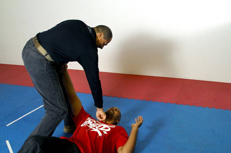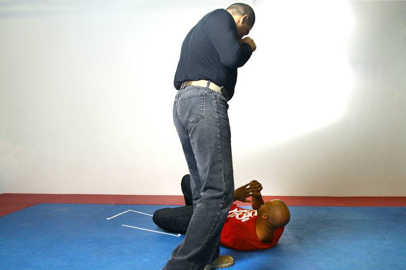 Any time we take an opponent to the ground, we will immediately circle around to his head and away from his legs. This is to avoid any possible counters from the downed opponent.